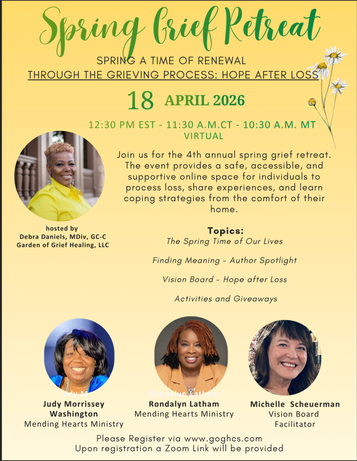 Grief Retreat – GOGH will plan, implement and host your event, tailored to your organization or group needs. GOGH currently facilitates bi-annual grief retreats providing grief education. Experts in their specific areas provide valuable information and strategies. Pricing available.