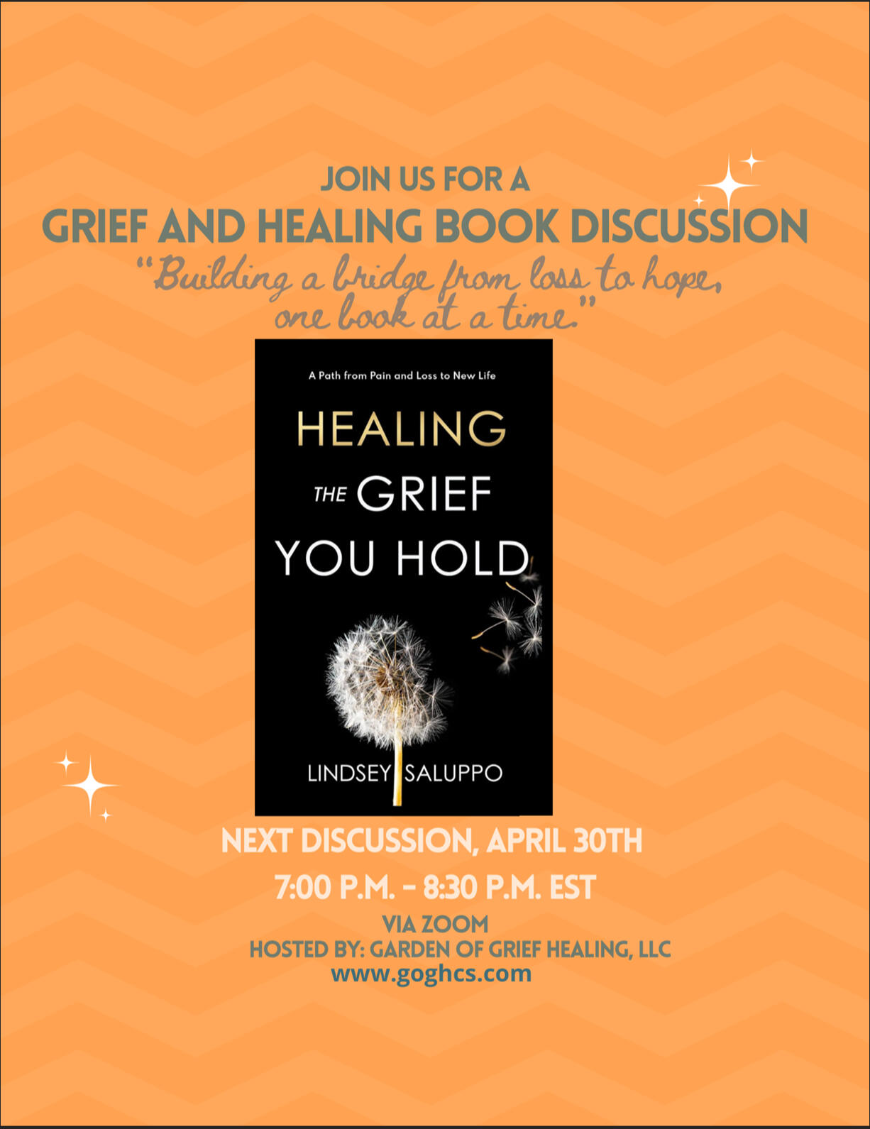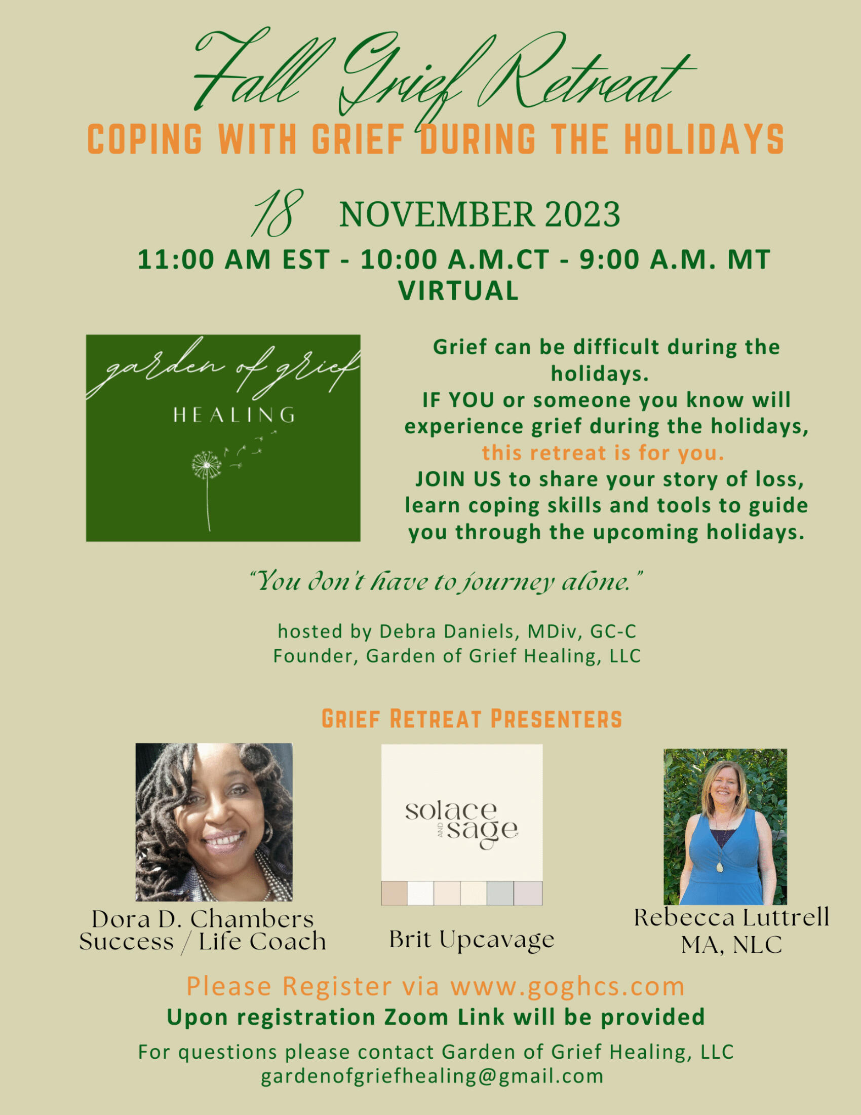 Grief Retreat – GOGH will plan, implement and host your event, tailored to your organization or group needs. GOGH currently facilitates bi-annual grief retreats providing grief education. Experts in their specific areas provide valuable information and strategies. Pricing available.