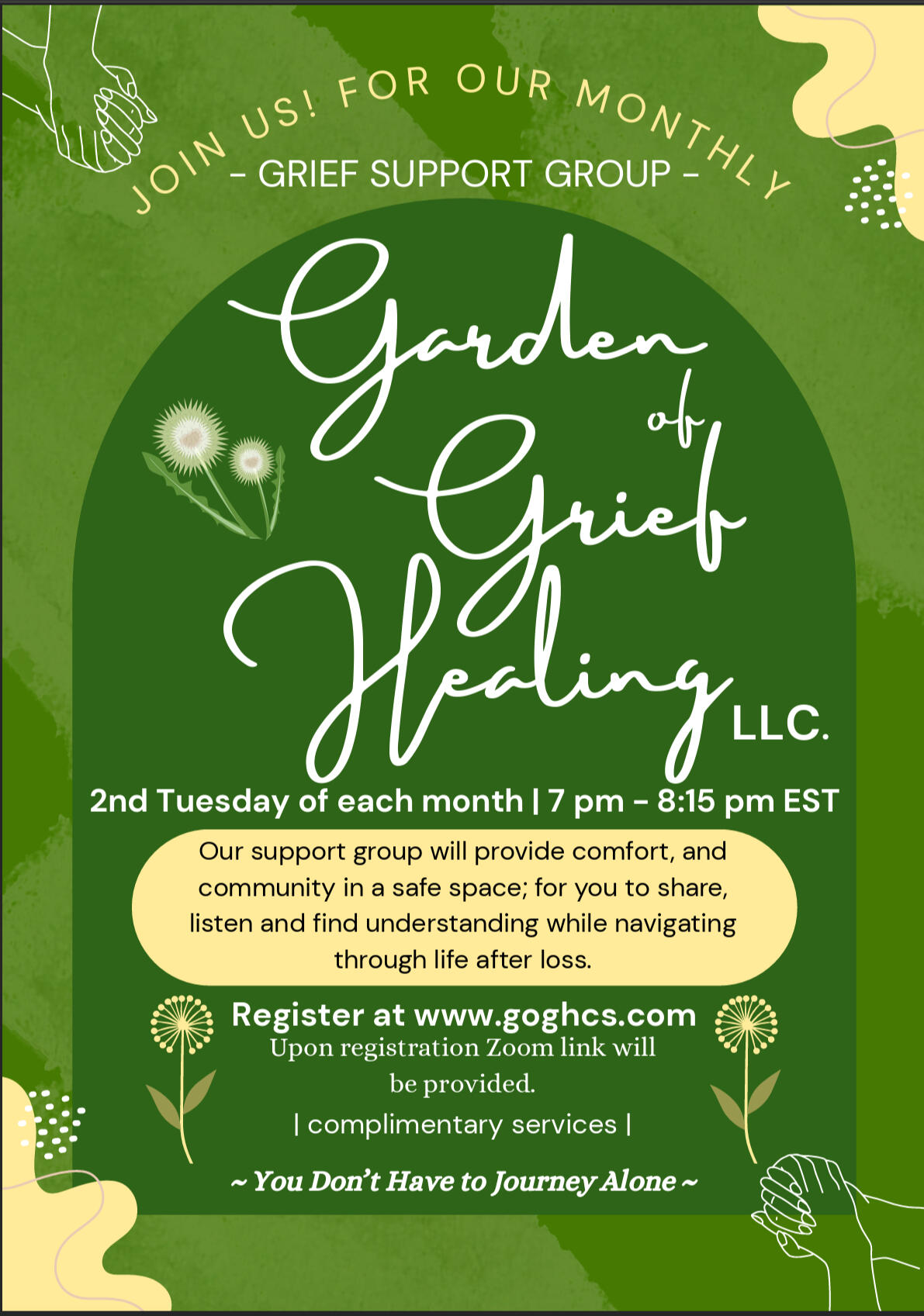 Group Support – Monthly virtual (national) or in-person (local) small cell groups on a monthly basis. While providing a safe space for those grieving to share emotions and thoughts. Those grieving will experience emotional support and compassionate community while moving through their grief process. No cost for this service.